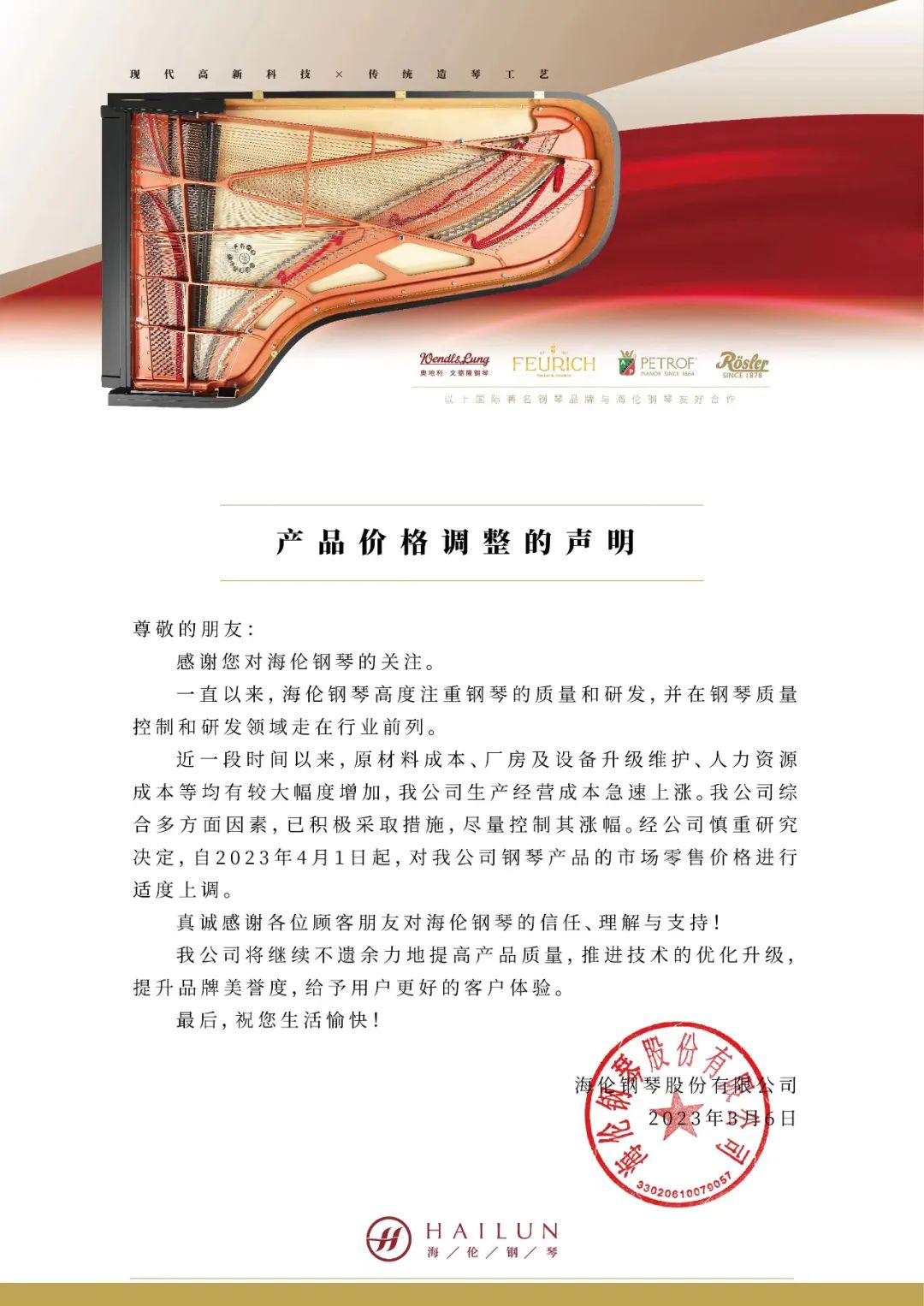 聚焦海倫丨海倫鋼琴股份有限公司產品價格調整聲明